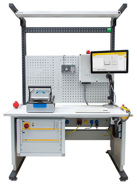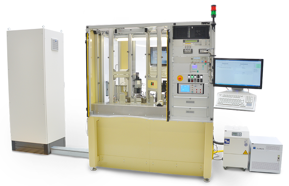 Test stand for testing coils with integrated displacement measuring system. The coils are tested electrically and the displacement measuring system is calibrated. The rotary table provides 8 positions with the following functions: