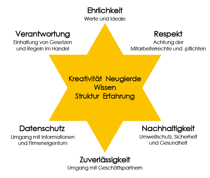 Die Leistungen für unsere Produkte und Dienstleistungen erbringen unsere technischen Mitarbeiter mit den dafür notwendigen persönlichen Eigenschaften wie Kreativität, Neugierde, Wissen, Struktur und Erfahrung. Den Rahmen, in dem diese Qualitäten wachsen können, bilden die sechs Verhaltensgrundsätze, welche mit dem Stern symbolisiert und die hiermit formuliert und dokumentiert sind.